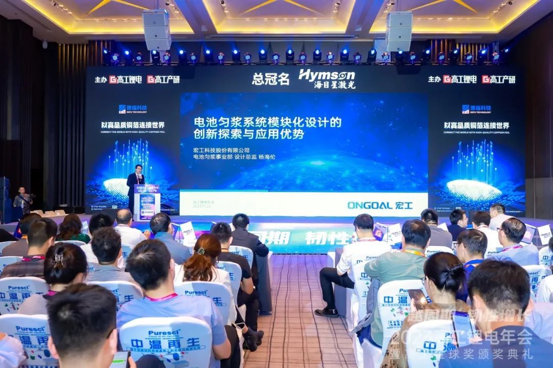 11月21-23日,以“穿越周期 韌性增長”為主題的2023高工鋰電年會盛大舉行。宏工科技電池勻漿事業部設計總監楊海倫發表主題為“電池勻漿系統模塊化設計的創新探索與應用優勢”的演講,并收獲“2023年度投資價值企業獎”。