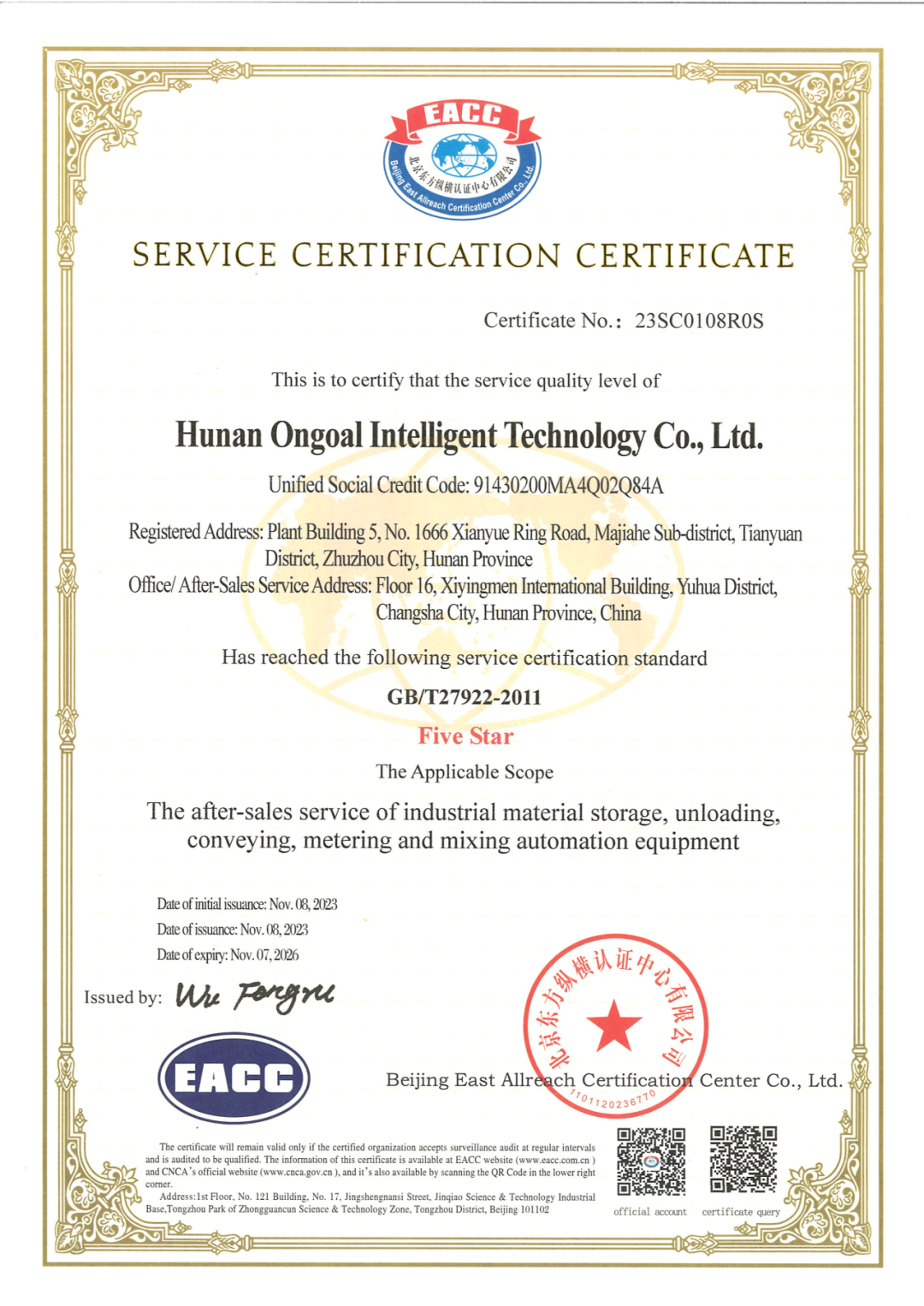 近日,宏工科技子公司湖南宏工智能科技有限公司售后服務(wù)通過質(zhì)量服務(wù)五星級(jí)認(rèn)證,標(biāo)志著宏工科技的服務(wù)能力與品質(zhì)得到行業(yè)和權(quán)威機(jī)構(gòu)的高度認(rèn)可。