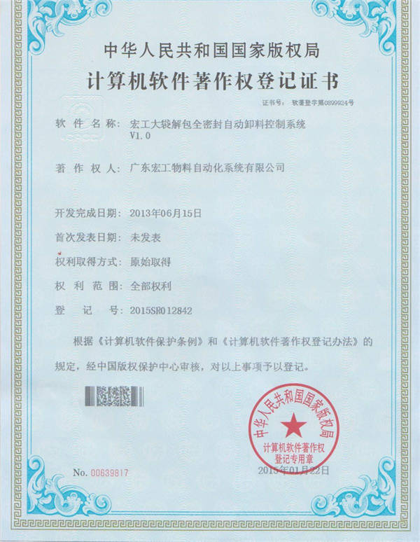軟件著作權(quán)-宏工大袋解包全密封自動(dòng)卸料控制系統(tǒng)V1.0